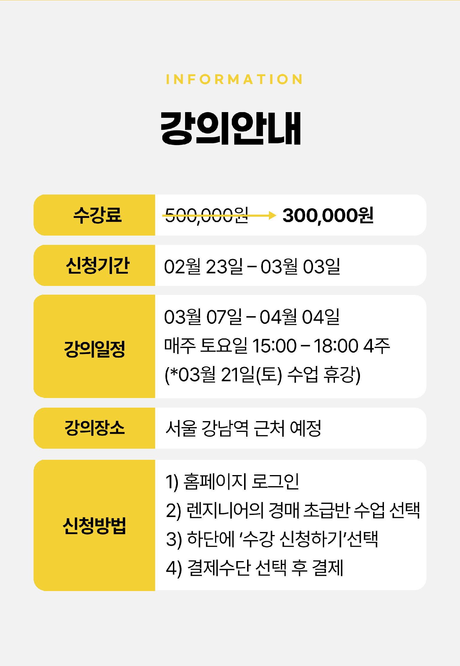 강의 일정 : 03월 07일 ~ 04월 04일 매주 토요일 15:00 – 18:00, 4주