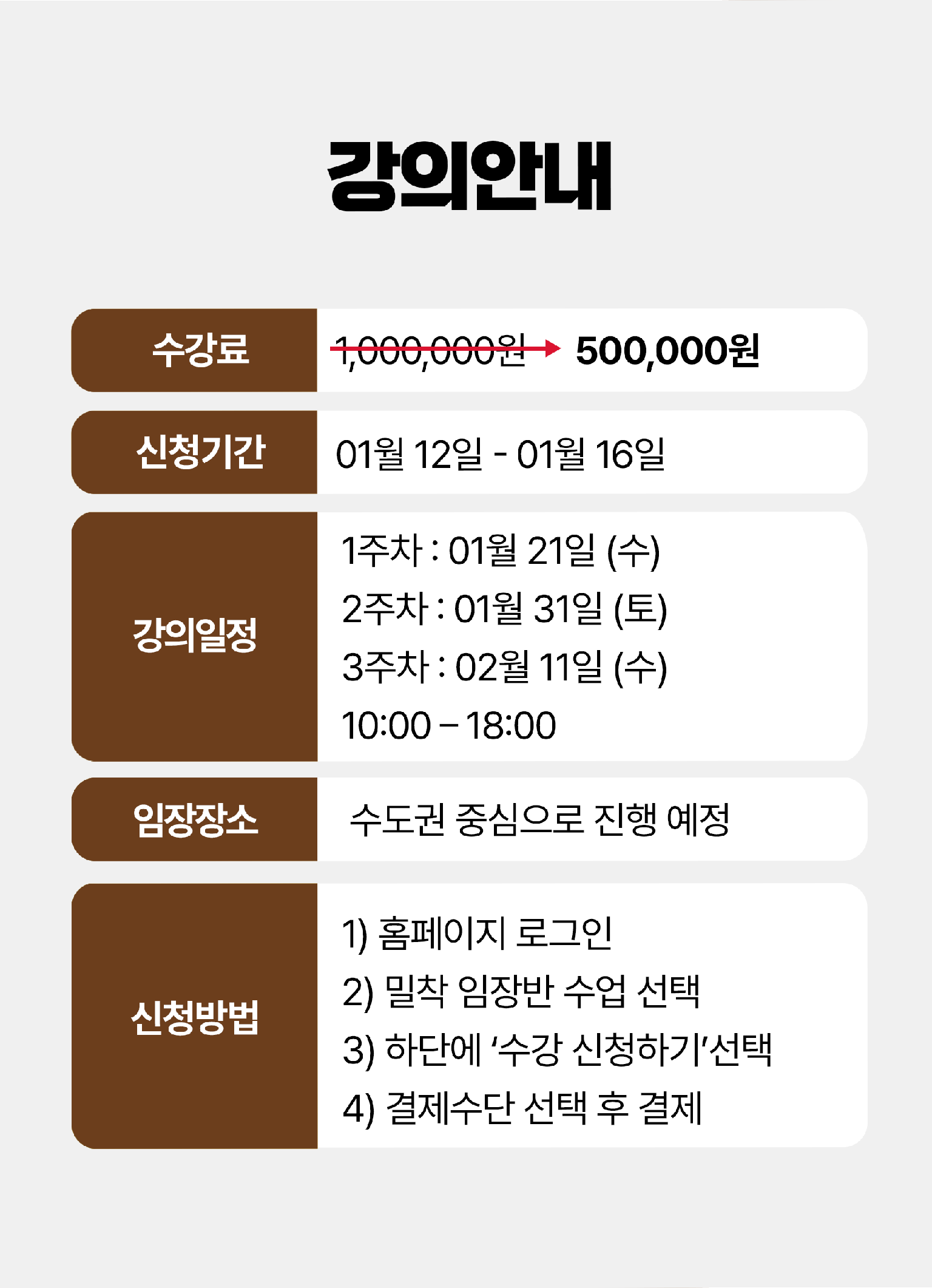 현장 인터뷰 훈련 투자 실습 설계 3명 1조 소그룹 운영 01월 21일(수), 01월 31일(토), 02월 17일(수) 현장 임장 |